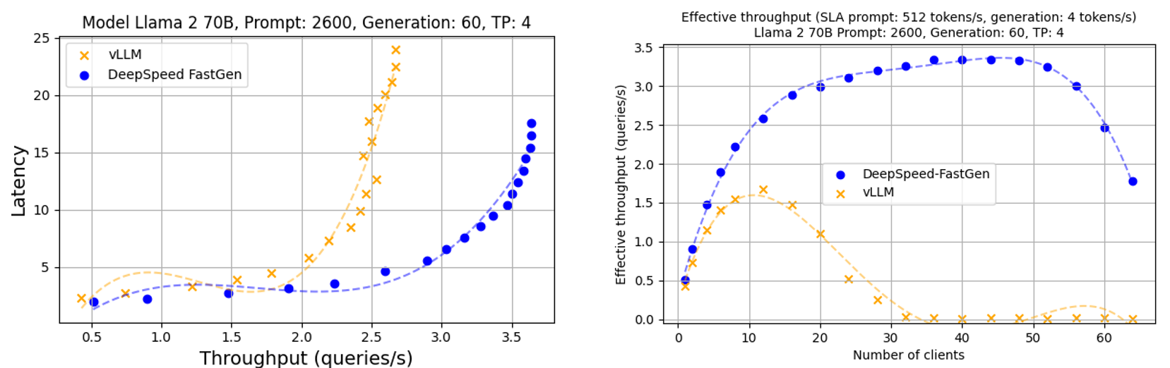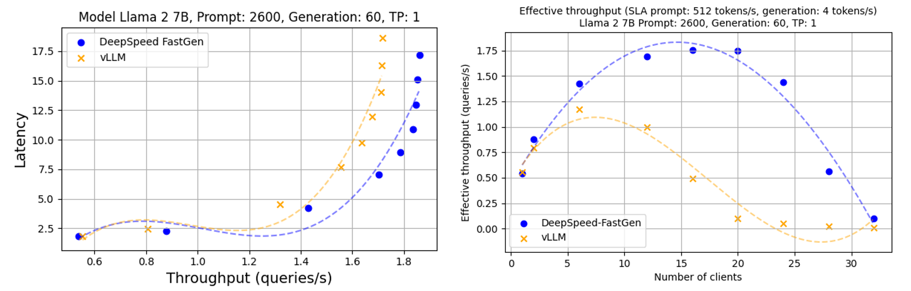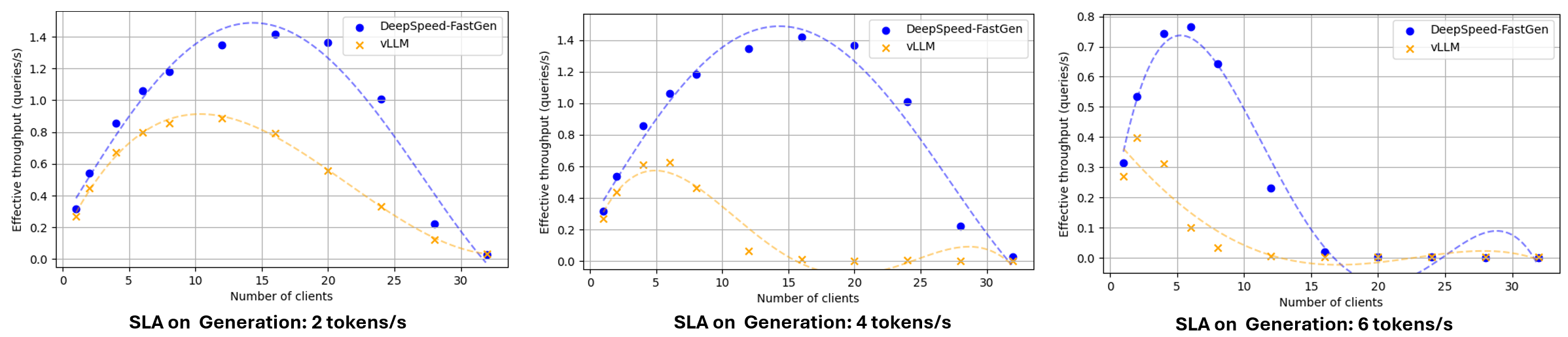 Under the effective throughput analysis that considers both first token latency and the rate at which generation occurs, DeepSpeed-FastGen provides up to 2.3x higher throughput than vLLM. Figure 4 presents a comparative analysis of the effective throughputs of DeepSpeed-FastGen and vLLM. Each plotted point denotes the effective throughput derived from a specific number of clients. As we scaled the number of clients, we initially observed an increase in effective throughput. However, the latency also significantly increases as the number of clients approaches the system’s capacity, causing many requests to fail in meeting the SLA. Consequently, the effective throughput will either saturate or decrease at some point. From a usability perspective, it’s not particularly relevant how many clients are required to achieve the max effective throughput; the maximum point of the line is the optimal serving point.