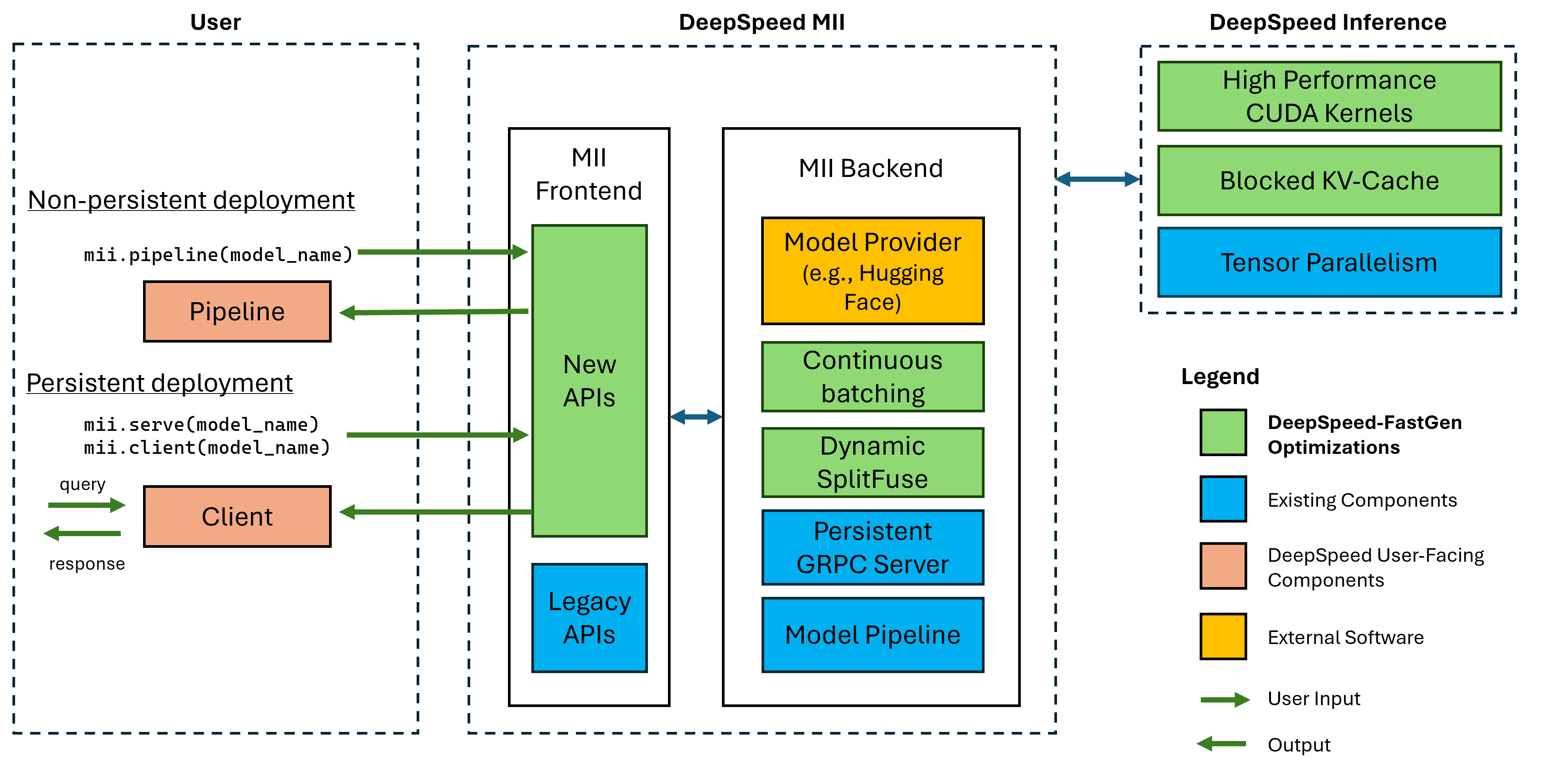 DeepSpeed-FastGen is the synergistic composition of DeepSpeed-MII and DeepSpeed-Inference as illustrated in the figure below. Together, both of these software packages provide various components of the system including the frontend APIs, the host and device infrastructure to schedule batches using Dynamic SplitFuse, optimized kernel implementations, and the tools to construct new model implementations.