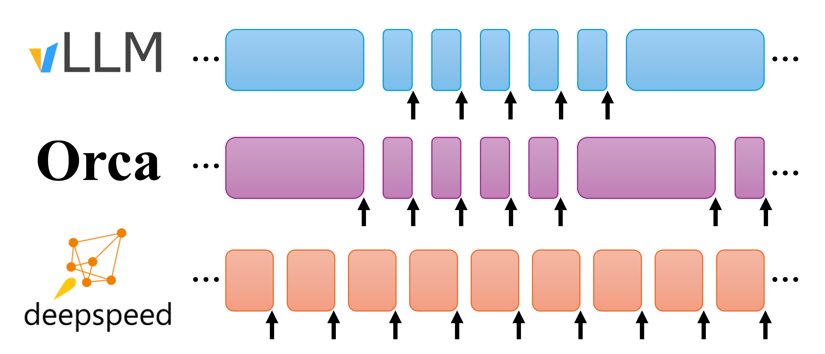 Figure 1: Illustration of continuous batching strategies. Each block shows the execution of a forward pass. An arrow indicates that the forward pass has sequences with one or more tokens generated. vLLM performs either token generations or prompt processing in a forward pass; token generation preempts prompt processing. Orca runs prompts at their complete length alongside generation. Dynamic SplitFuse performs dynamic composition of fixed-sized batches composed of both generation and prompt tokens.