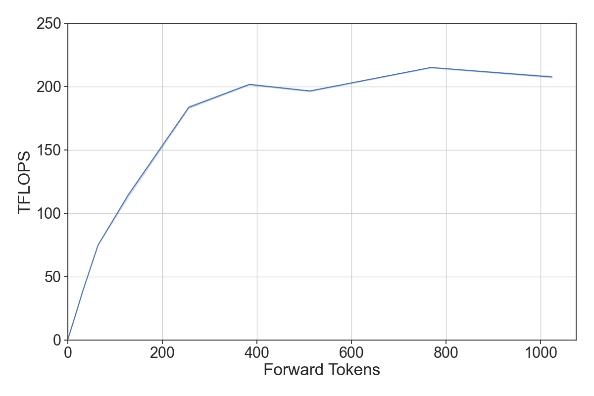 2. How does a model’s throughput respond to changing the number of tokens in the forward pass? An LLM has two key operating regions with a relatively steep transition. With a small number of tokens, the GPU bottleneck is reading the model from memory and so throughput scales with the number of tokens, whereas with many tokens the model is throughput bound by compute and sees near-constant throughput. The model should run highly efficiently if all forward passes are in the throughput-saturating region.