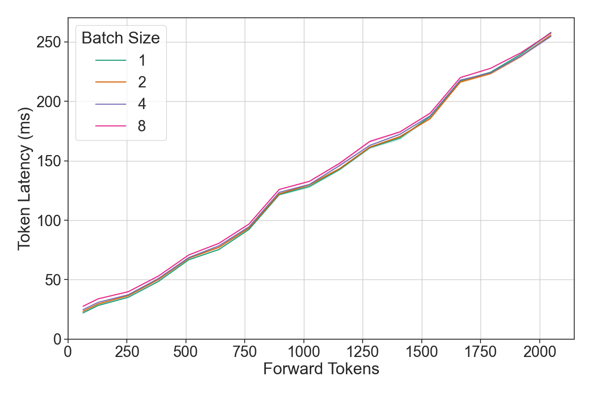 1. What factors impact the forward pass of a single LLM? In order to effectively schedule, it is necessary to understand what are the relevant independent variables the scheduling loop should control. We observe below that the composition of sequences in a forward pass (the batch size in sequences) has a negligible impact on performance compared to the raw number of tokens in the forward pass. This means an effective scheduler can be built around a single signal, the number of tokens in the forward pass.