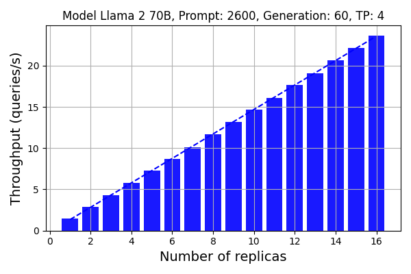 Figure 6: Scalability using the load balancing feature. A normal distribution was applied to prompt and generation lengths with averages of 2600 and 60, respectively, and a 30% variance