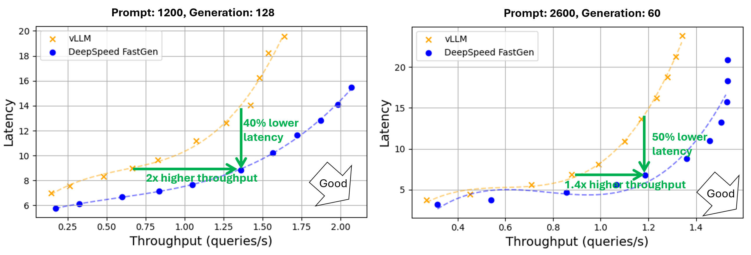 We are glad to present DeepSpeed-FastGen, a system that overcomes these limitations by leveraging the proposed Dynamic SplitFuse technique and offers up to 2.3x higher effective throughput compared to state-of-the-art systems like vLLM. DeepSpeed-FastGen leverages the combination of DeepSpeed-MII and DeepSpeed-Inference to provide an easy-to-use serving system.