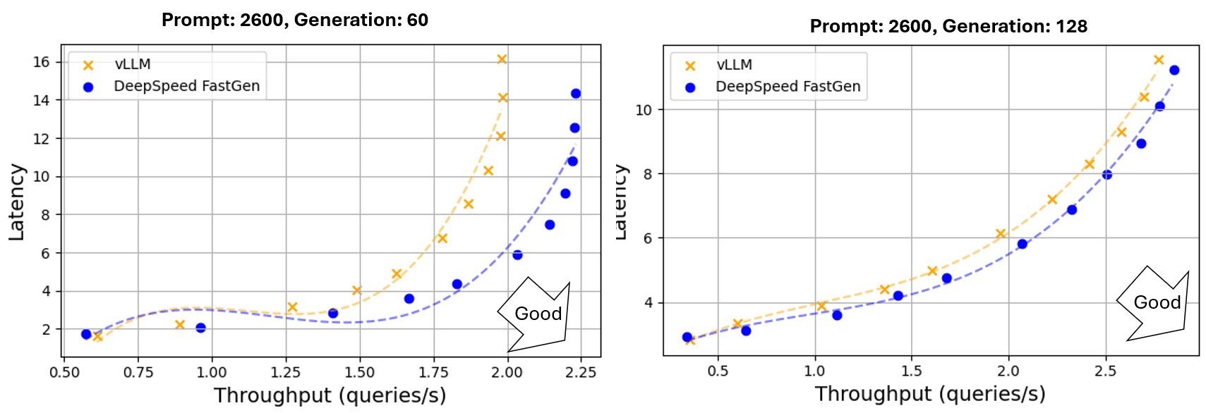 When vLLM preempts the ongoing generation of previous requests, the generation latency experiences a notable increase. This leads to vLLM’s effective throughput appearing lower than its directly measured throughput. At vLLM’s peak, the effective throughput was 0.63 queries/sec and around 28% of requests failed to meet the 4 tokens/s SLA. At the same SLA, DeepSpeed-FastGen achieved 1.42 queries/sec (less than 1% of requests failed to meet the SLA), which is 2.3x higher than vLLM.