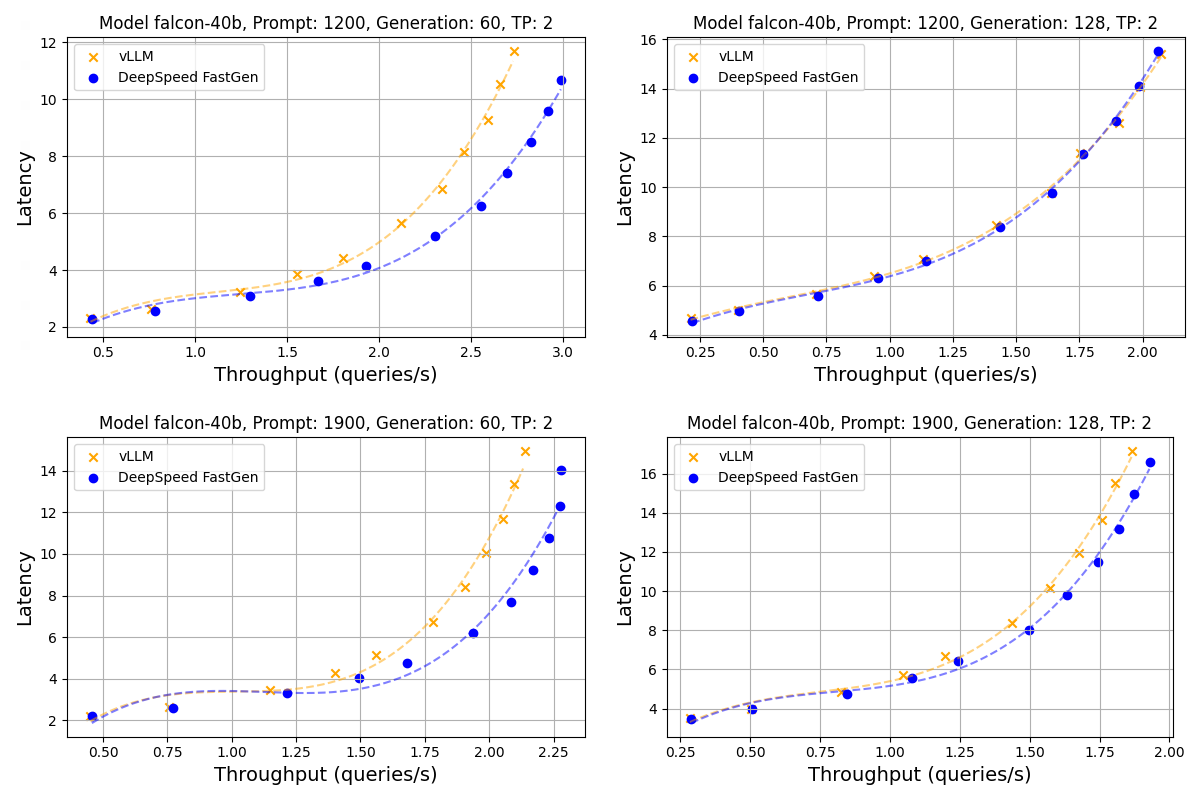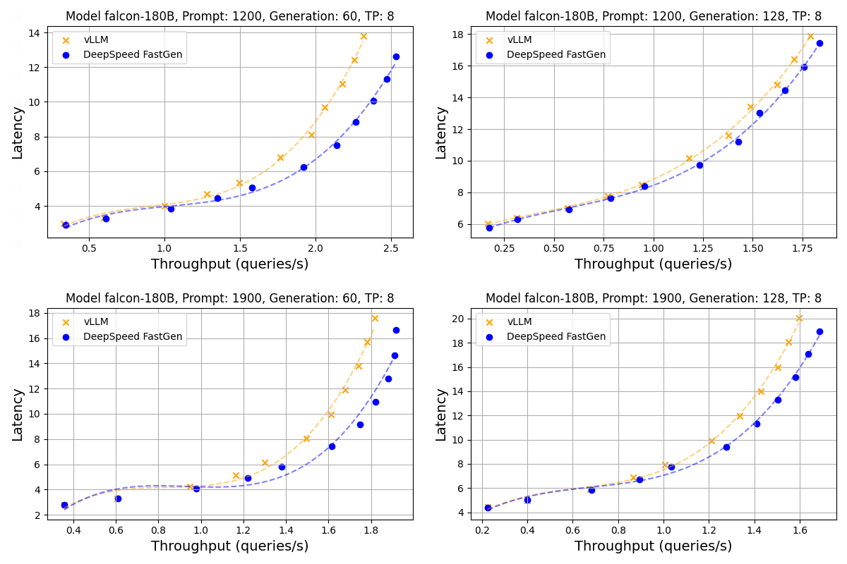 As seen in Figure 4 and Figure 5, DeepSpeed-FastGen is able to provide higher throughput and lower latency compared to vLLM for Falcon-40B and Falcon-180B.