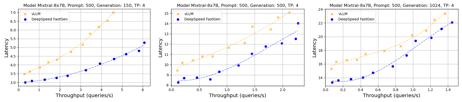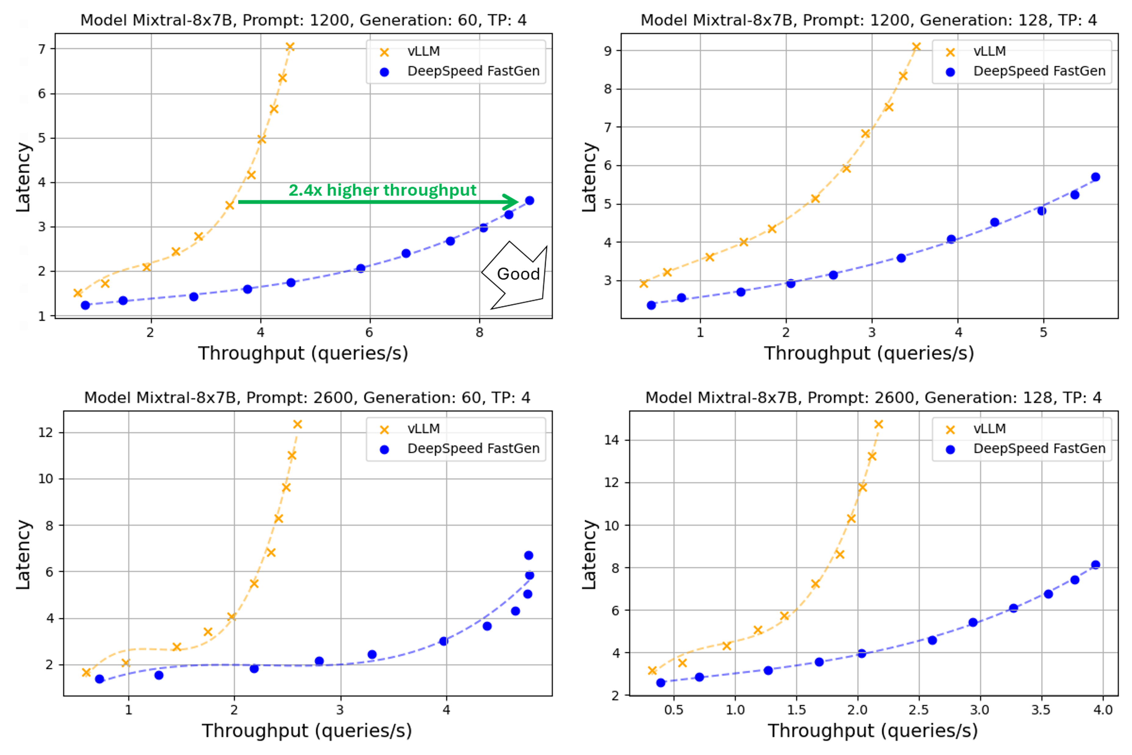 We show the throughput-latency of Mixtral-8x7B-v0.1 running on A100 with tensor parallelism degree of 4. First, we show the scenarios where the prompt lengths are longer than the number of generation steps (i.e., tokens), which is typical of popular use cases like chatbots. From Figure 1, DeepSpeed-FastGen provides 2.4X higher throughput for a prompt length of 1200 and 60 generation steps. In addition to the performance for the long prompt scenarios, we present new results for shorter prompts and larger number of generation steps in Figure 2. Our performance advantage still holds.