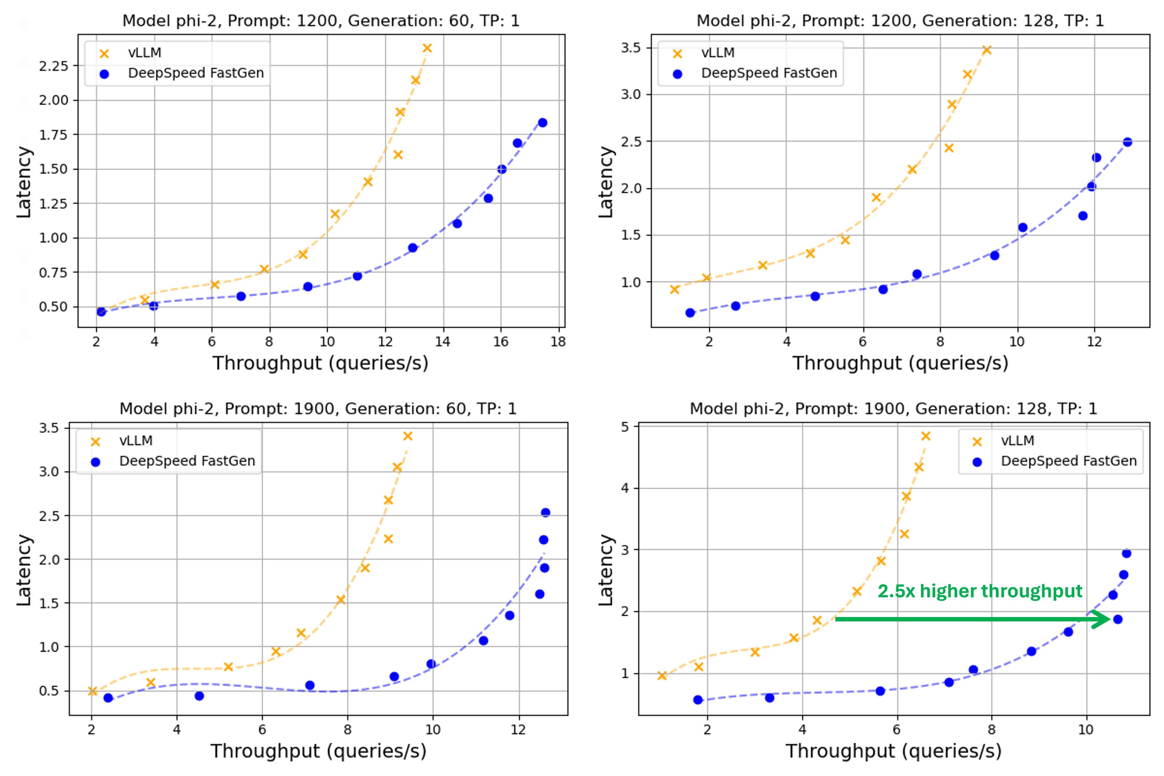 From Figure 3, DeepSpeed-FastGen provides 1.5X higher throughput for a prompt length of 1900 and 60 generation steps. For other scenarios our throughput-latency evaluation of the Phi-2 model show a similar pattern, with DeepSpeed-FastGen providing equivalent latency with greater throughput or lower latency for the same throughput.