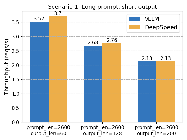 - DeepSpeed-FastGen only outperforms vLLM in scenarios with long prompts and short outputs, due to its Dynamic SplitFuse optimization. This optimization is on vLLM’s roadmap.